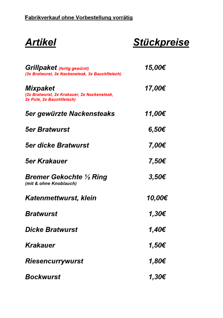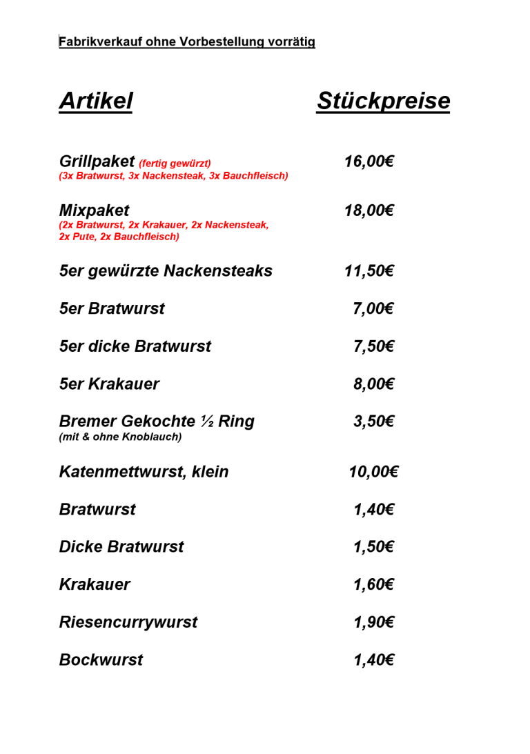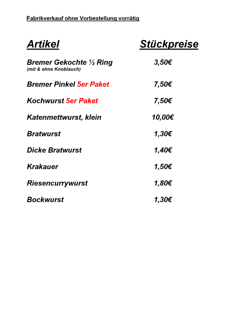 Werksverkauf Preisliste